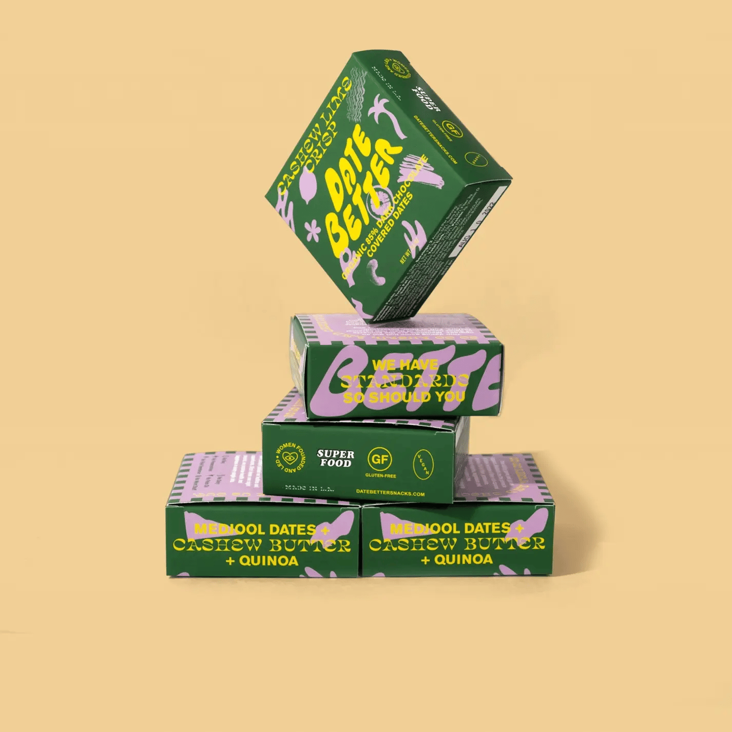 Date Better Snacks is a fresh-ground nut butter stuffed Medjool date, all dressed up in a coat of rich 85% organic chocolate. And the cherry on top? Less than 1 gram of added sugar. From handpicking the finest Medjool dates to melting the perfect chocolate, they’re all about giving you the best.